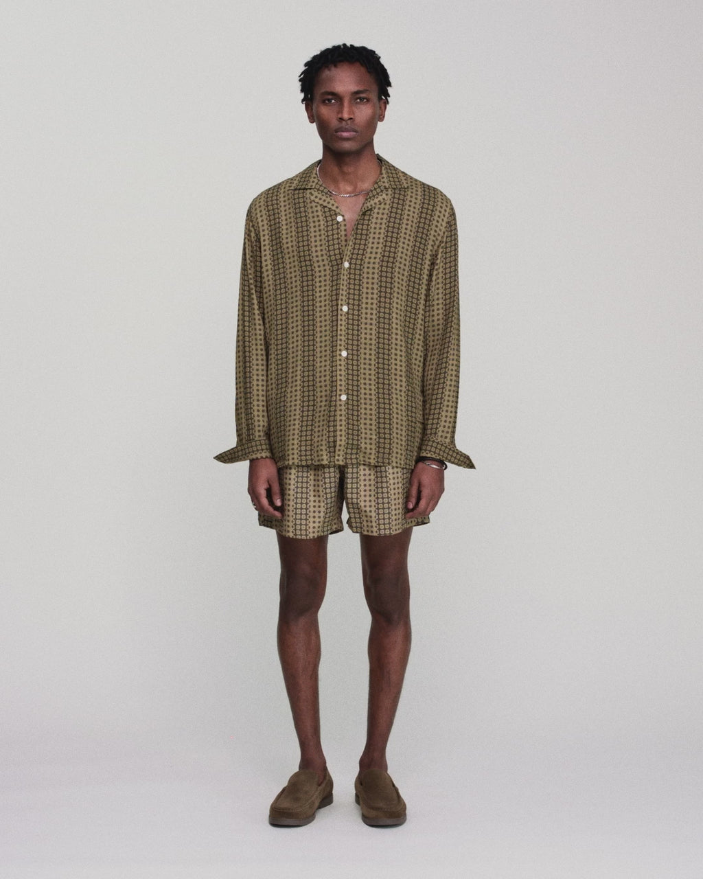 OAS Regalia swim shorts are tailored from a quick-drying shell fabric adorned with a geometric motif that channels '70s spirit. Cut for a relaxed, straight fit with an elasticized drawstring waistband and built-in mesh briefs for comfort and support. Keep your keys and cards securely stored in the hidden zip pocket.