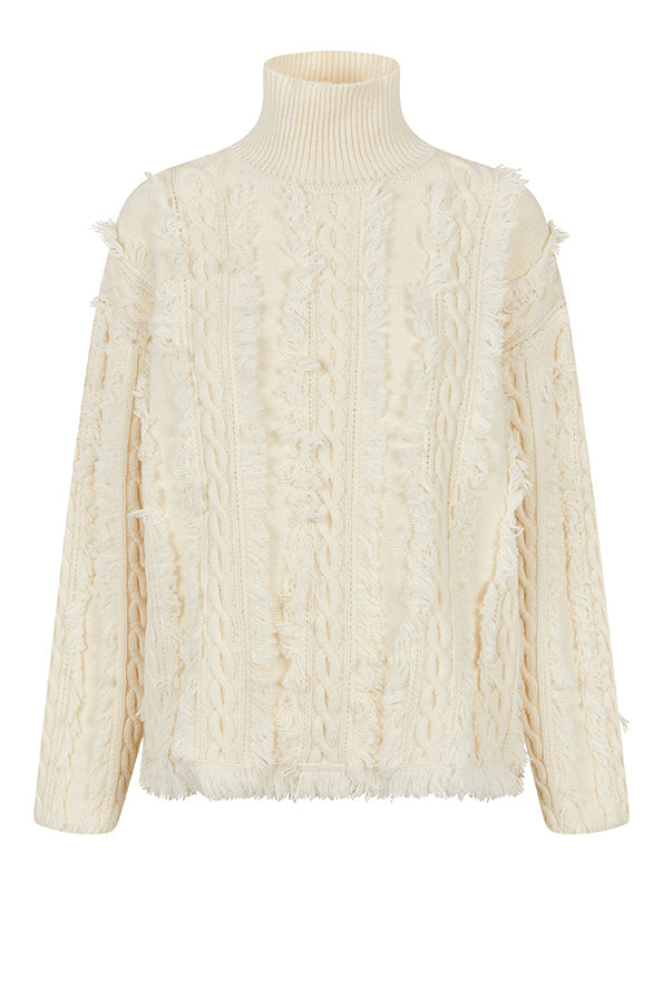 Second Female pullover with fringing. The pullover is made in a soft wool-cotton blend with cable knit pattern and fringing details. Featuring a round neck with dropped shoulders and long sleeves. Wide and relaxed fit.