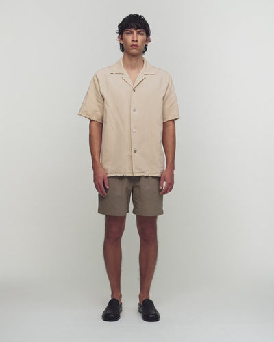 OAS Taupe linen shorts are tailored from a breezy blend of linen and cotton to a mid-rise fit that sits just below the waist. Style details include multiple pockets and a comfortable drawstring waistband. Perfect for smart-casual summer outings.
