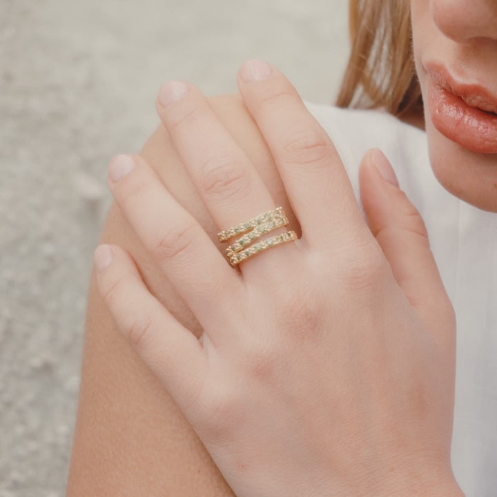 A modern take on the half-eternity ring, Amalia Green ring by Agapee features three stacked bands that wrap around the finger.