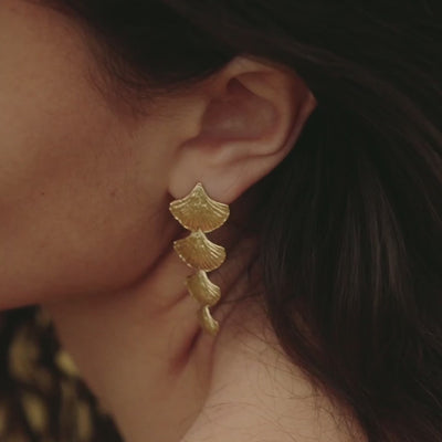 Agapee's golden rendition of the ginkgo tree leaves captures its mesmerizing deep-yellow foliage, as well as its strength, resilience and tranquility. These long dangling and sculptural pendant earrings are a true showstopper.