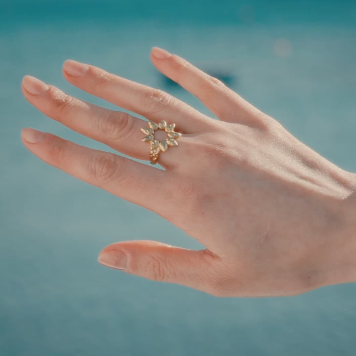 A modern take on floral design, the Hélia ring by Agapee is inspired by an open sunflower, featuring large sunray-like petals, a molten surface, and a bold geometric silhouette.