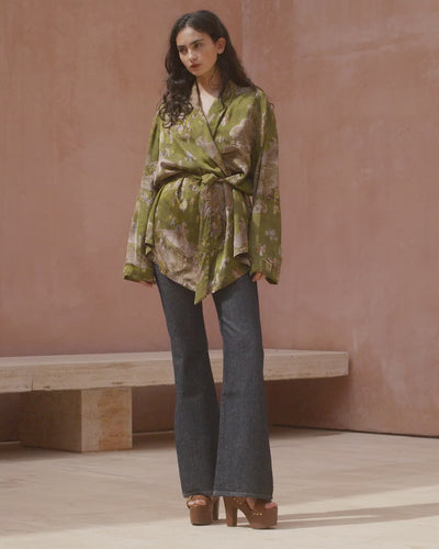 This viscose jacquard kimono by Mes Demoiselles is presented on a deep green background, elevated by a refined print playing with contrasts.