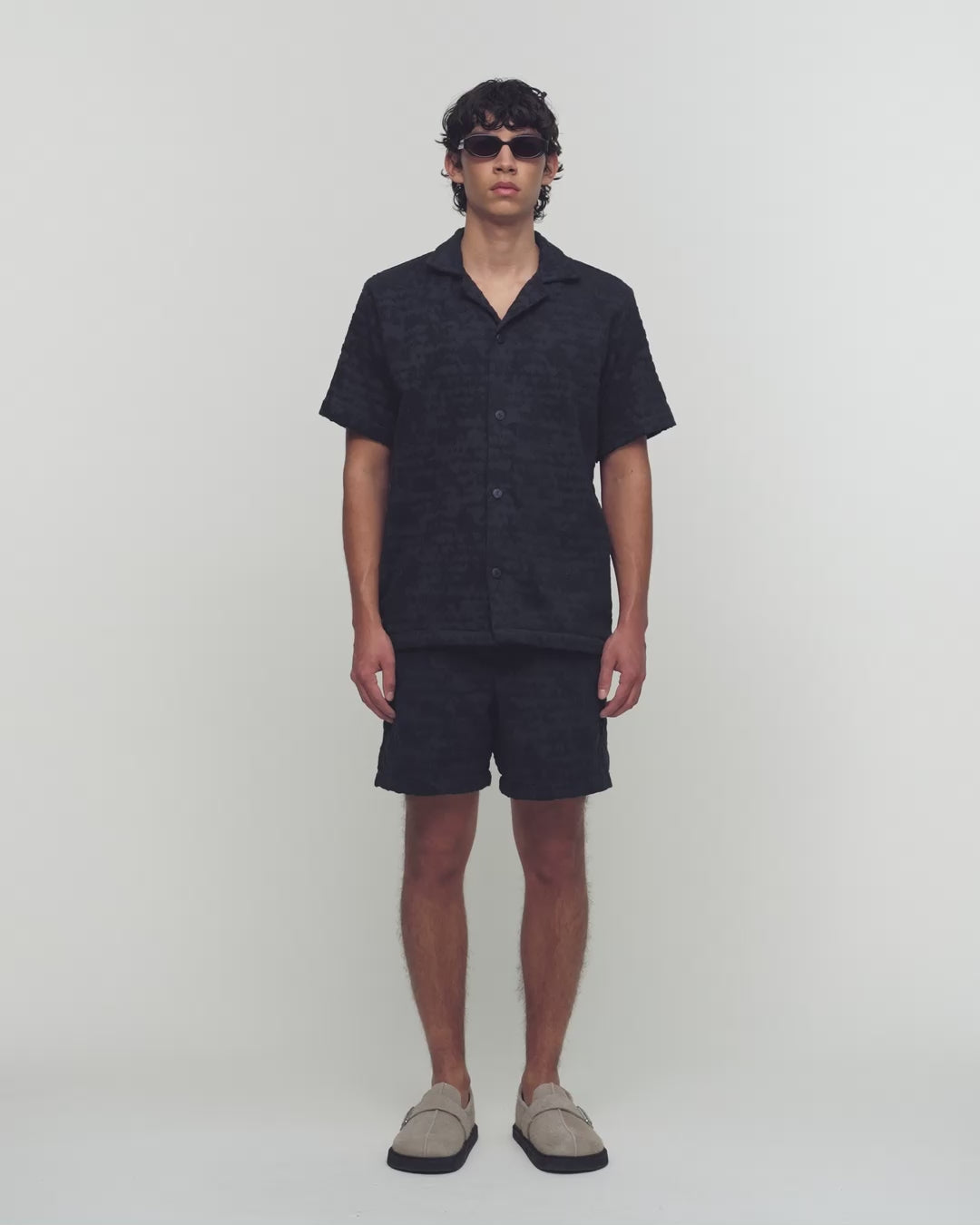 OAS Night Lagoon Terry Shirt - Dark navy jacquard terry shirt with tonal abstract pattern. Relaxed fit with dropped shoulders and button closure, made from heavyweight cotton terrycloth.