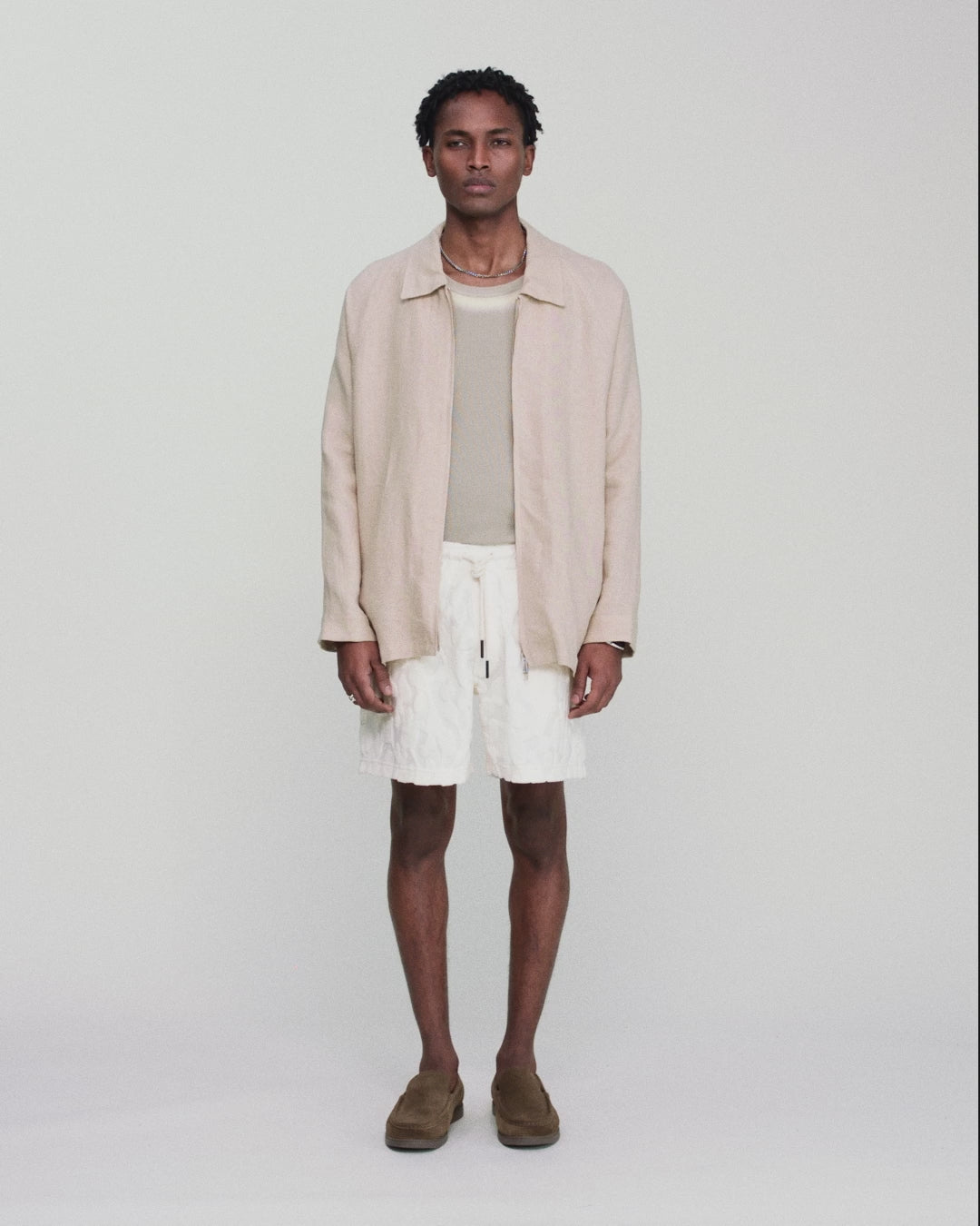 OAS Terry Shorts in Summit - White shorts in heavyweight jacquard terry with textural pattern. Elastic waist, two side pockets and one back pocket. Regular fit and mid-rise.