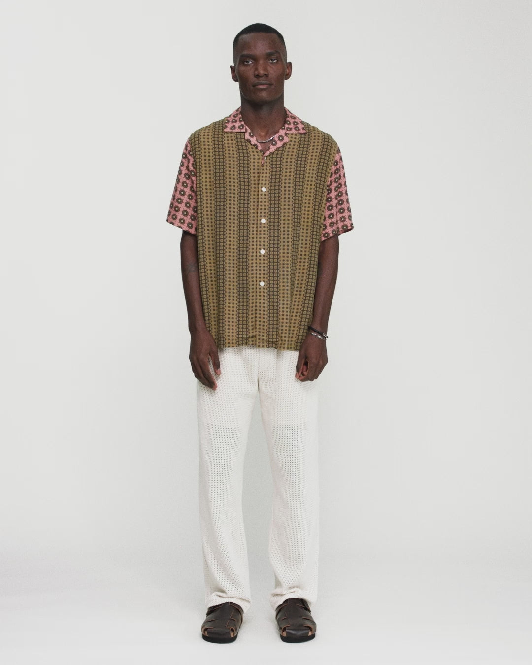 The Reverie viscose shirt by OAS is an easy-going fit with a resort collar that extends into a buttoned front. Tailored from a breezy viscose fabric characterized by a silky soft feel, adorned with a geometric print duo rich with bohemian flair. Ideal for warm-weather lounging.