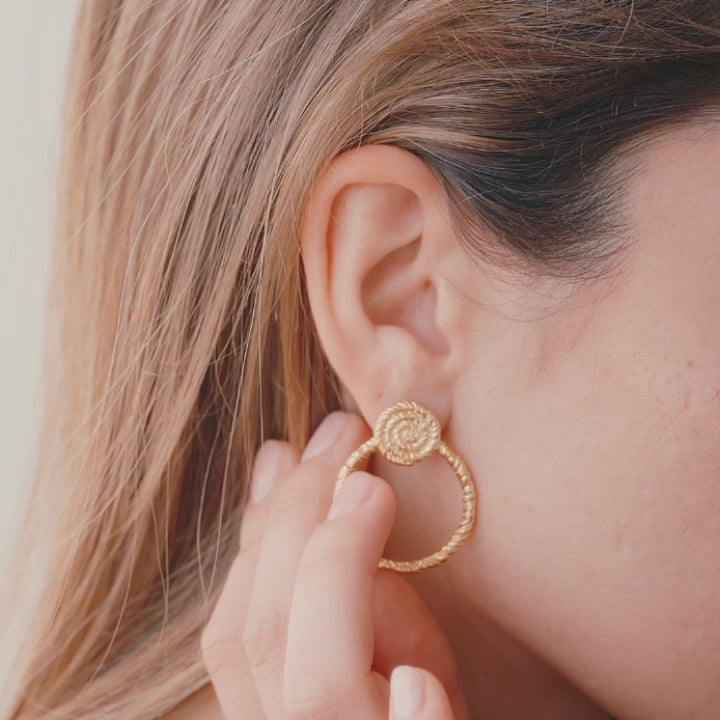 Agapee Zeti, twisted circle hoop earrings with a braided spiral accent at the base.